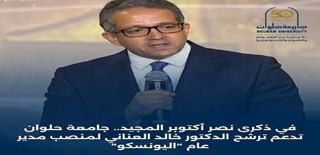 في أجواء وطنية مفعمة بالفخر والاعتزاز بذكرى نصر السادس من أكتوبر المجيد، أعلنت جامعة حلوان برئاسة الدكتور السيد قنديل، والسادة النواب، وأعضاء هيئة التدريس، والعاملين، والطلاب، دعمهم الكامل لترشح الدكتور خالد العناني، وزير السياحة والآثار الأسبق، لمنصب المدير العام لمنظمة الأمم المتحدة للتربية والعلم والثقافة “اليونسكو”.