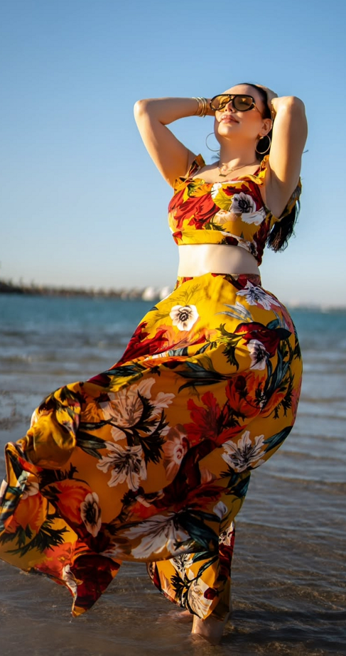 وتألقت عبير صبري ، مرتدية جيب طويلة باللون الأصفر تميزت برسومات ملونه وجذابة، ونسقت معها توب مكشوف البطن بنفس اللون ليكشف عن جمالها ورشاقتها.