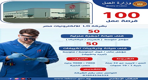 وزارة العمل .. توفير 100 فرصة عمل جديدة بشركة LG للإلكترونيات مصر،