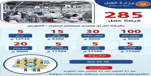 أعلنت وزارة العمل اليوم، عن توفير 285 فرصة عمل جديدة بشركة إس آي وايرنج سيستمز إيچبت بالسويس، وذلك في إطار جهود الوزارة المستمرة لفتح مجالات جديدة للتشغيل وتوفير فرص عمل لائقة للشباب من مختلف المؤهلات.