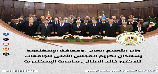 شهد الدكتور أيمن عاشور وزير التعليم العالي والبحث العلمي، والفريق أحمد خالد محافظ الإسكندرية، تكريم المجلس الأعلى للجامعات للدكتور خالد العناني المرشح المُنتخب لمنصب مدير عام منظمة اليونسكو من قبل المجلس التنفيذي للمنظمة، وأكد الوزير أن هذا النجاح يعكس إيمان الدولة بأهمية العلم والاستثمار في الإنسان، وهو ما تسعى إليه الوزارة من خلال تمكين الشباب وتعزيز وعيهم الوطني، مشيرًا إلى أن تولي أحد أبناء مصر قيادة هذه المنظمة يمثل تقديرًا دوليًا للمكانة الحضارية والتاريخية لمصر، وإيمانًا بدورها الرائد في ترسيخ قيم السلام والحوار والتنوع الثقافي، فضلًا عن المساهمة في تعزيز حضور مصر في المؤسسات الدولية، وإضافة نصر جديد للثقافة والدبلوماسية المصرية.