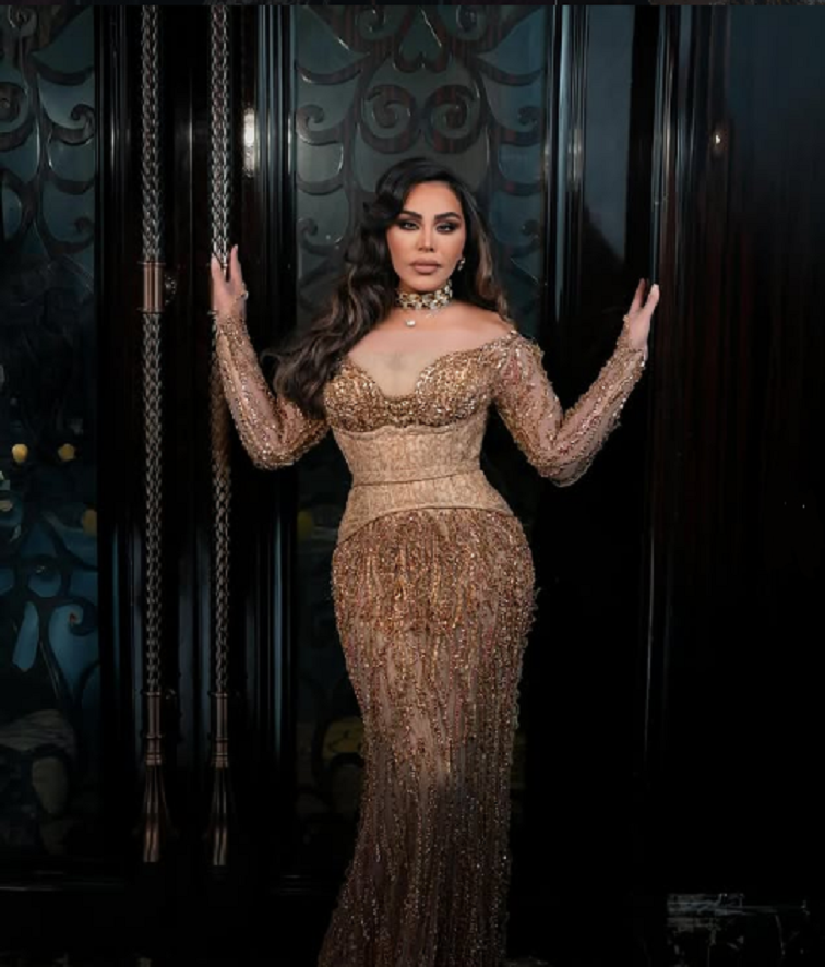 تألقت أحلام في الصور بإطلالة راقية، حيث ارتدت فستان طويل ذا أكمام طويلة واتسم التصميم بالقماش الذهبي اللامع بالكامل مما كشف عن رشاقتها.