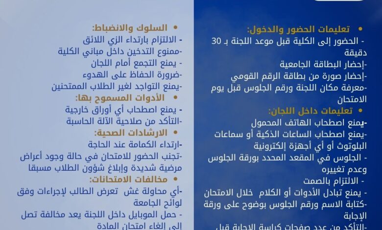 كما شددت التعليمات على الالتزام بالسلوك الجامعي اللائق، ومنع التدخين أو التجمعات داخل مباني الكلية، وضرورة مغادرة الحرم الجامعي فور الانتهاء من الامتحان.