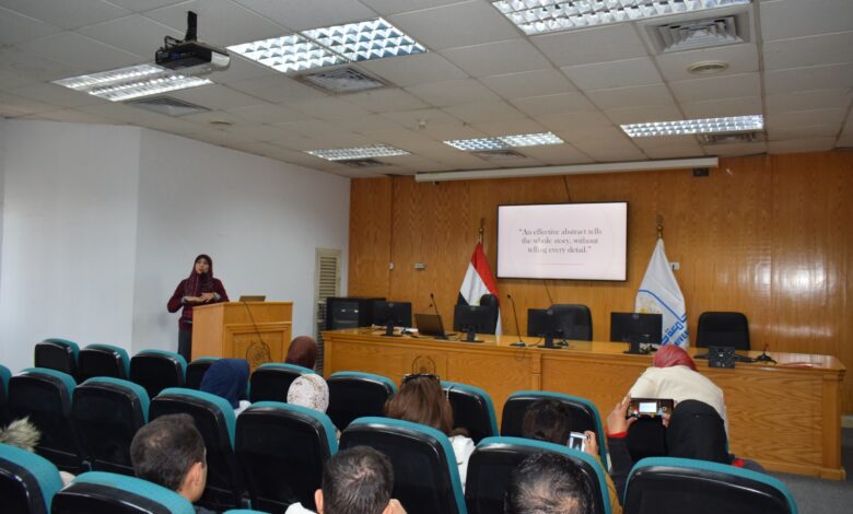 وقدمت الورشة الدكتورة نهلة منير، مدرس اللغة الإنجليزية بكلية الآداب ، حيث تناولت خلالها الأسس العلمية والمنهجية لكتابة الملخصات البحثية باحترافية، وأهم المعايير الدولية المعتمدة في صياغة في الأبحاث العلمية والرسائل الجامعية.