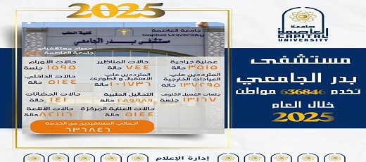 أعلنت جامعة العاصمة (حلوان سابقًا)، برئاسة الدكتور السيد قنديل رئيس الجامعة، عن حصاد إنجازات مستشفى بدر الجامعي خلال عام 2025، والذي مثّل عامًا استثنائيًا في مسيرة القطاع الطبي بالجامعة، حيث استقبل المستشفى 636,846 حالة، في تأكيد واضح على دوره الحيوي كأحد الأعمدة الأساسية لتقديم الخدمة الطبية المتكاملة للأهالي ، وذلك تحت رعاية الدكتور السيد قنديل رئيس الجامعة، وإشراف الدكتور ة رشا رفاعي عميد كلية الطب ورئيس مجلس المستشفيات الجامعية، والدكتور وائل عمر المدير التنفيذي للمستشفيات الجامعية.