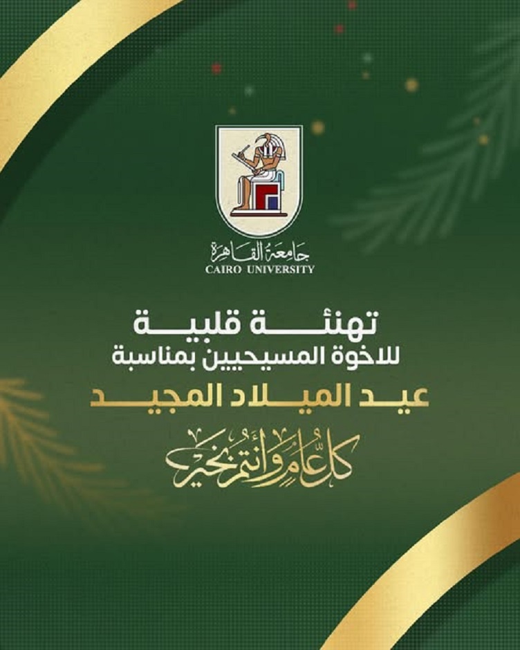 تقدم الدكتور محمد سامي عبد الصادق رئيس جامعة القاهرة، باسم مجلس الجامعة وأعضاء هيئة التدريس والعاملين، بخالص التهنئة القلبية لقداسة البابا تواضروس الثاني بابا الإسكندرية وبطريرك الكرازة المرقسية، وجميع الإخوة المسيحيين من جموع الشعب المصري ومن أعضاء هيئة التدريس والعاملين والطلاب بمناسبة عيد الميلاد المجيد، سائلا الله أن يعيده عليهم وعلى مصرنا الحبيبة بكل الخير والسلام فى ظل قيادة فخامة الرئيس عبدالفتاح السيسي رئيس الجمهورية.