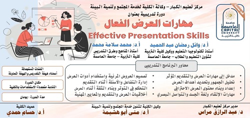 أعلنت جامعة العاصمة عن تنظيم برنامج تدريبي متخصص بعنوان مهارات العرض الفعالEffective Presentation Skills، تحت رعاية الدكتور السيد قنديل رئيس الجامعة، الدكتور وليد السروجي نائب رئيس الجامعة لشئون خدمة المجتمع وتنمية البيئة، الدكتور/ حسام حمدي عميد كلية التربية، الدكتور/ مِنّى أبو هشيمة وكيل الكلية لشئون خدمة المجتمع وتنمية البيئة.