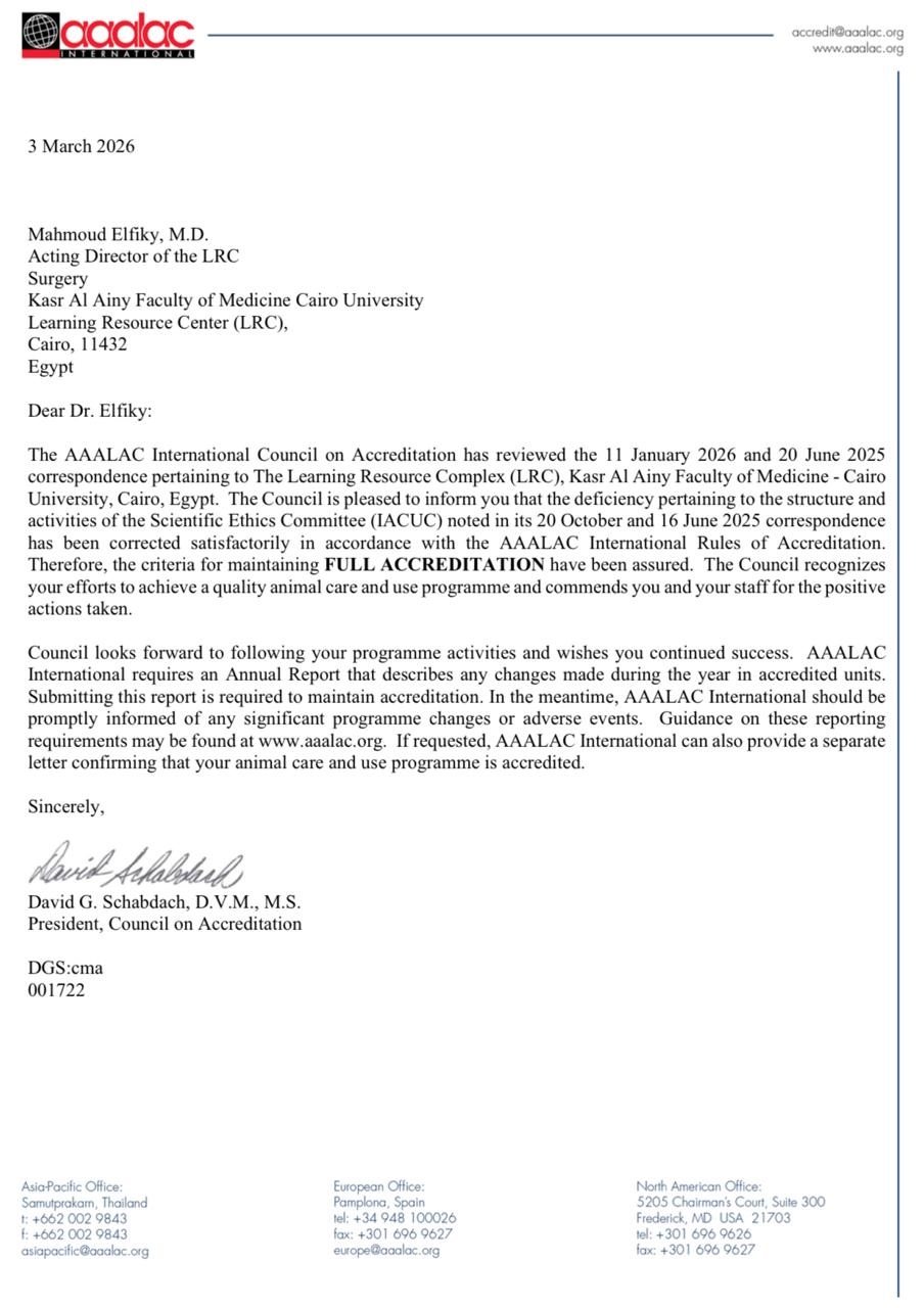 أعلن الأستاذ الدكتور حسام صلاح مراد عميد كلية الطب – قصر العيني ورئيس مجلس إدارة مستشفيات جامعة القاهرة، حصول مجمع التعليم المتطور والبحوث الحيوانية بالكلية على الاعتماد الدولي الكامل من منظمة AAALAC International.