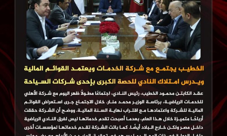 الخطيب يجتمع مع شركة الخادمات ويعتمدالقوائم المالية ويدرس امتلاك النادى للحصه الكبرى باحدى شركات السياحة