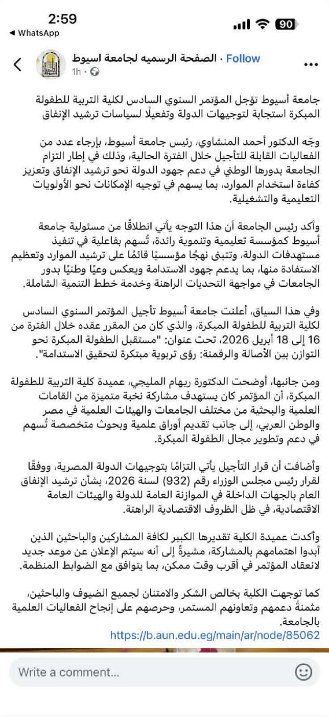 وبعد أن أشرت إلى هذه الجامعات، وعددها عشر جامعات، والتي كانت تصر على عقد مؤتمراتها العلمية متحدية قرار رئيس الوزراء، واستمرار البذخ في الإنفاق بمثل هذه المؤتمرات ـ قررت جامعة أسيوط بعد أن كنت قد تواصلت مع رئيسها د. أحمد المنشاوي تأجيل كل الفعاليات التي كانت ستتم في كل كلياتها، وفي مقدمتها المؤتمر السنوي السادس لكلية التربية للطفولة المبكرة، والذي كان من المقرر عقده خلال الفترة من 16 إلى 18 أبريل 2026، تحت عنوان: “مستقبل الطفولة المبكرة نحو التوازن بين الأصالة والرقمنة.. رؤى تربوية مبتكرة لتحقيق الاستدامة”.
