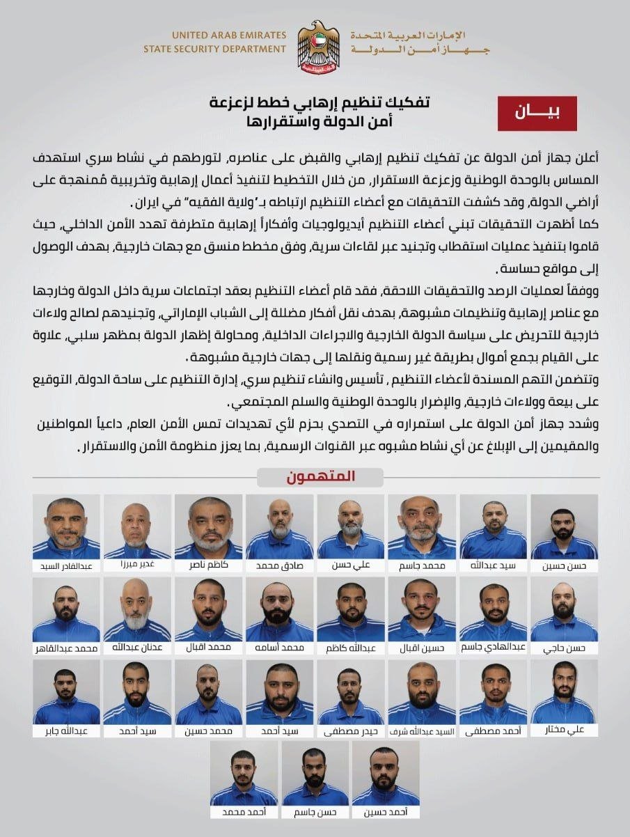 أعلنت دولة الإمارات ممثلة في جهاز أمن الدولة، عن تفكيك تنظيم إرهابي وضبط عناصره، إثر تورطهم في نشاط سري استهدف المساس بالوحدة الوطنية وزعزعة استقرار البلاد عبر التخطيط لأعمال إرهابية وتخريبية ممنهجة.